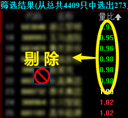 ★步骤二:通过以上筛选之后,再把量比小于1的全部剔除,这部分个股都是没有成交萎靡,人气不足的,次日拉升概率低。